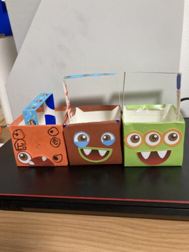 牛乳パックに好きな色の画用紙を貼り付け、目玉や口を貼ってデコレーションしました✨