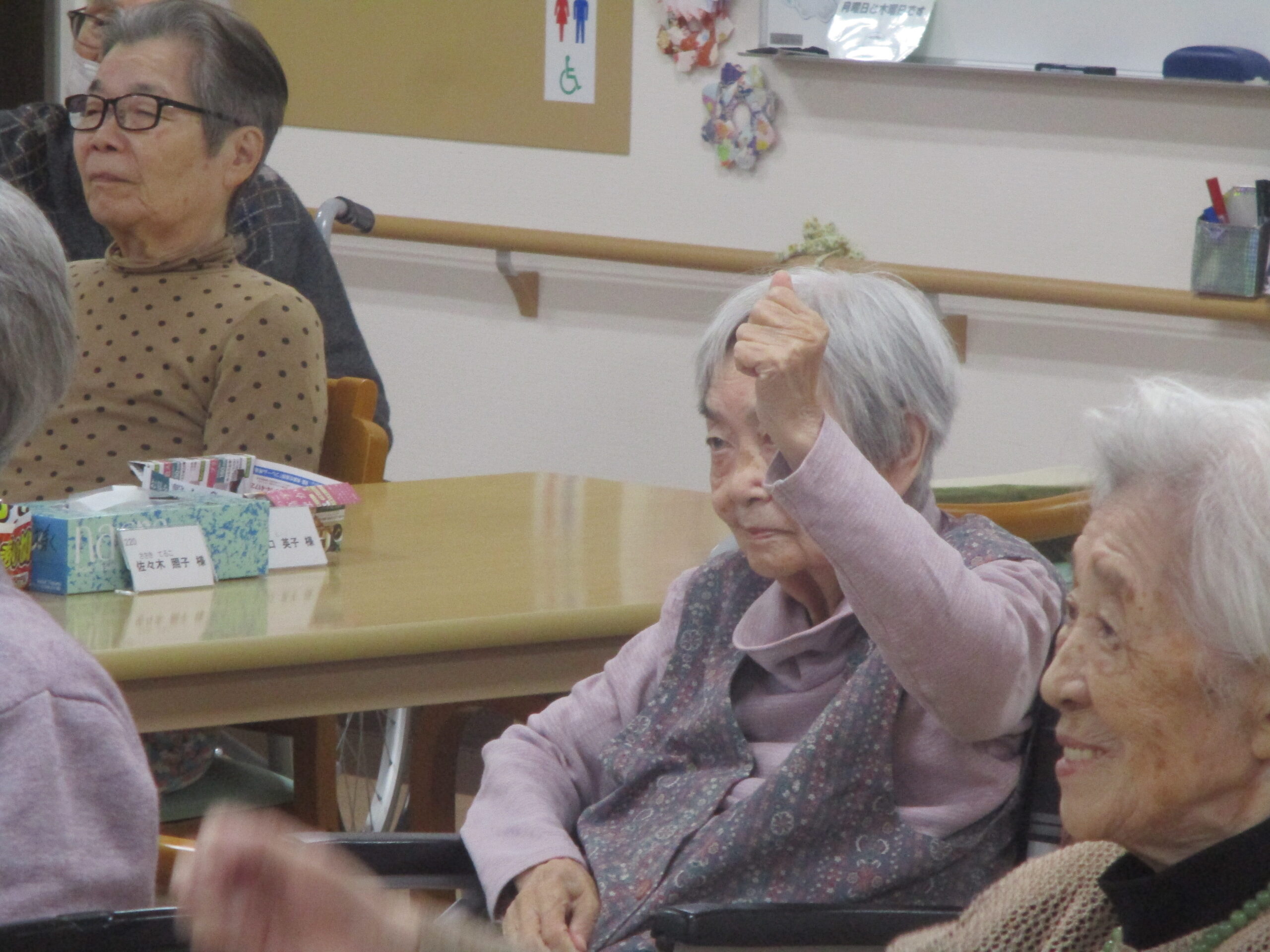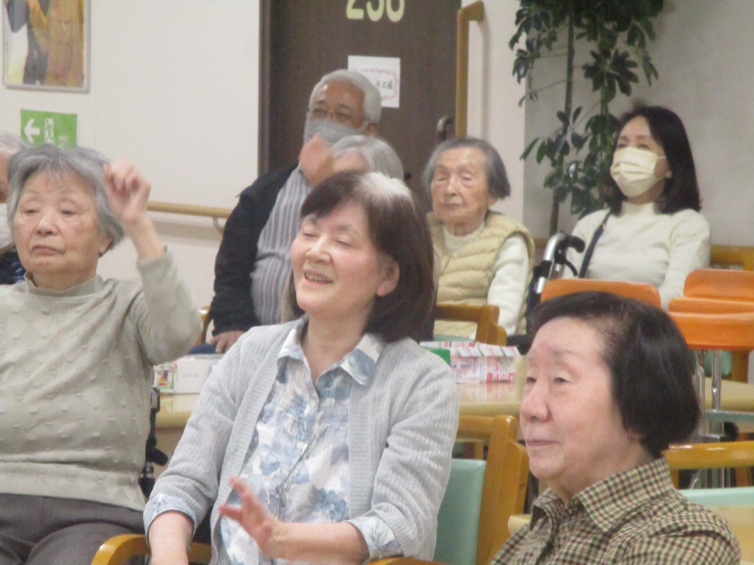 皆さんの様子見て見ますと積極的に体を動かしながら元気よく体操に参加されておりましたね。「とても良い運動になった。また来て体操やって欲しい。」と笑顔で話されておりました。いい気分転換になってとても良かったですね。体操の時、たくさんの笑顔みれてとてもいきいきされておりましたね。本日のブログは体操の様子でした。では、明日のブログもお楽しみに。