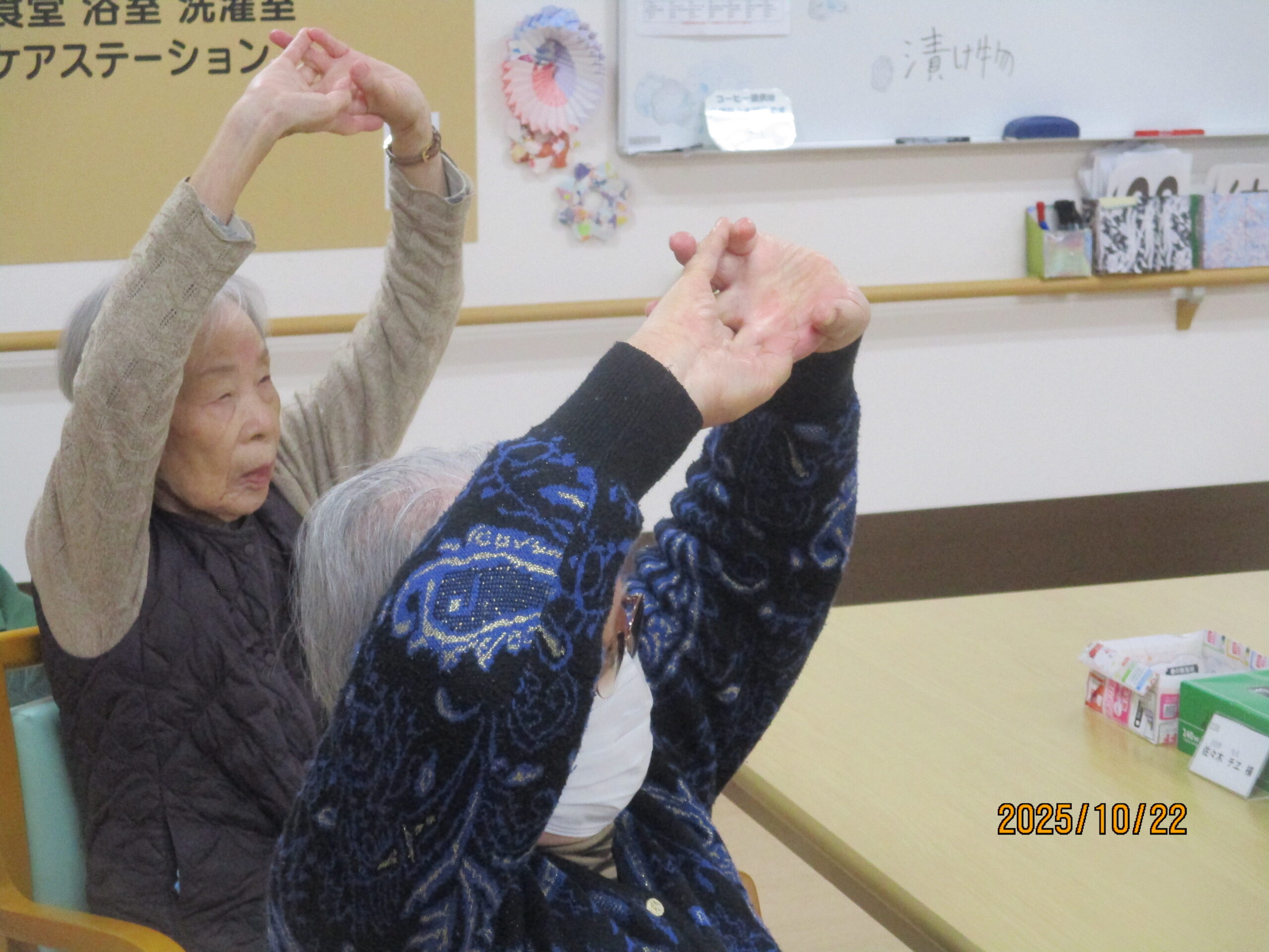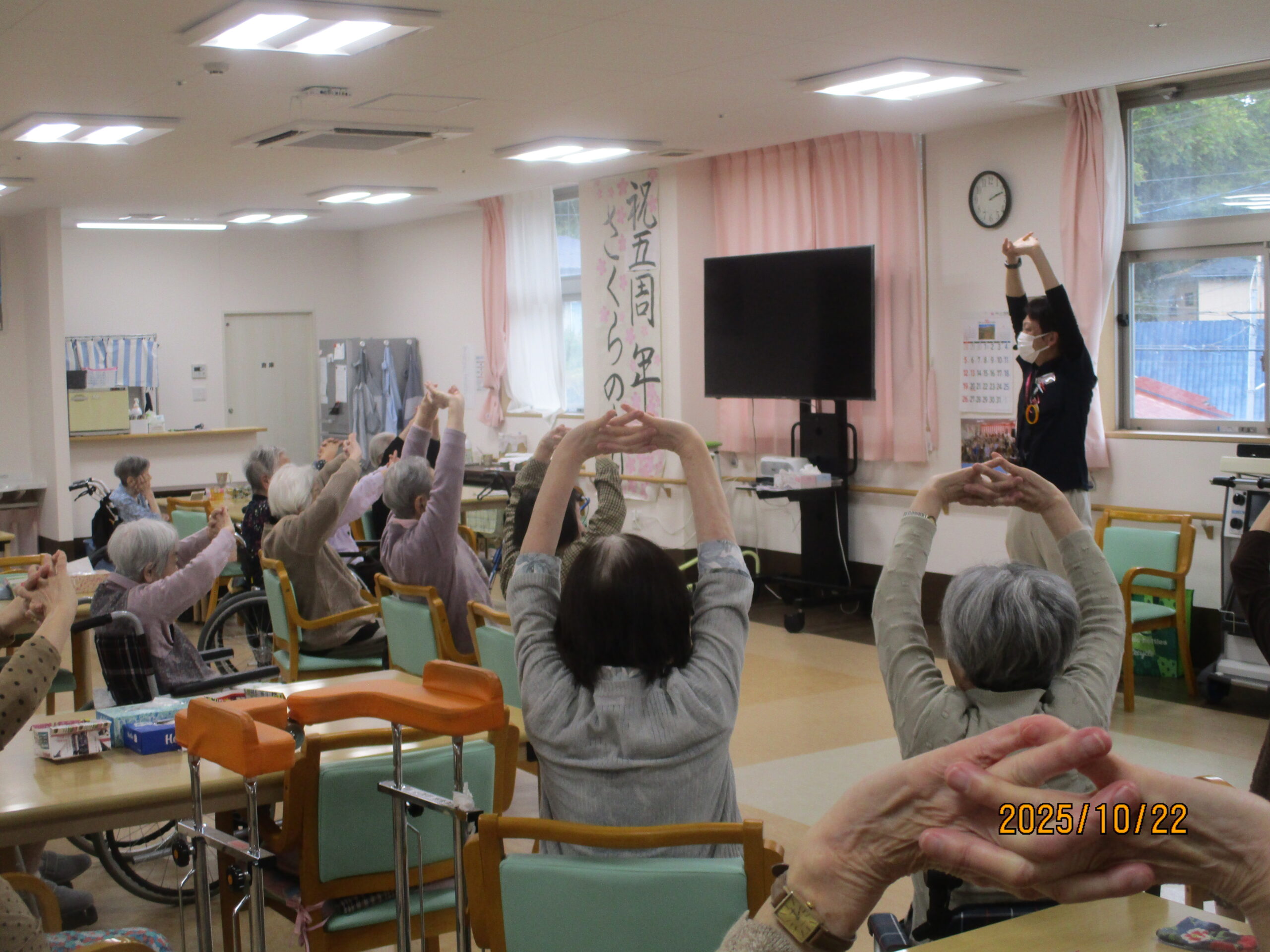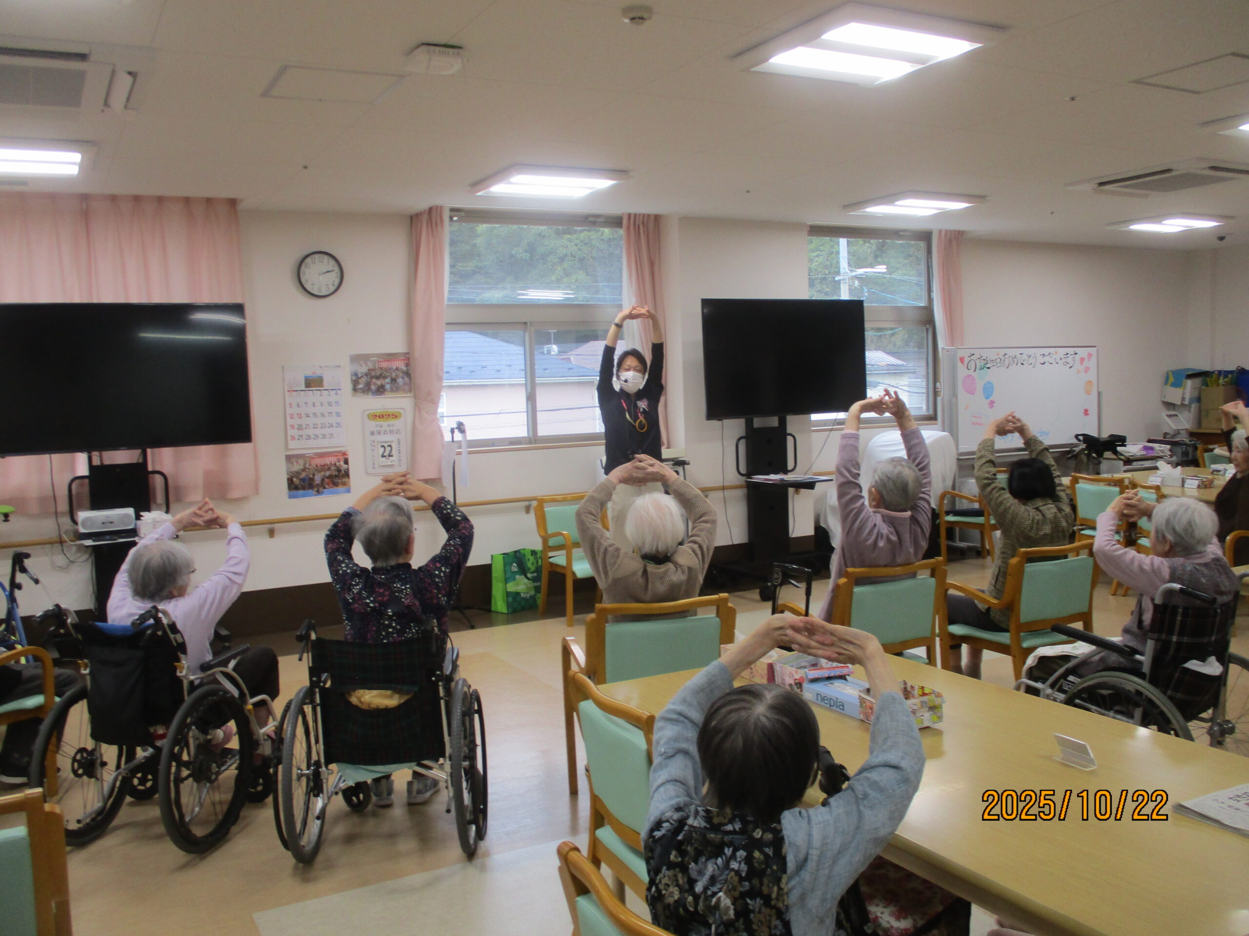 皆さん、こんにちは。10月ももう少しで終わりで段々寒くなってきましたね。今日は午後から2階でフレアス健康体操を行いましたのでその様子を見ていきましょう。
