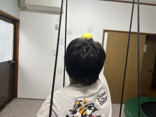 壁に書かれた1から10までの数字の的を、ブランコに乗りながらボールを使って1から順番に当てていくというものです。