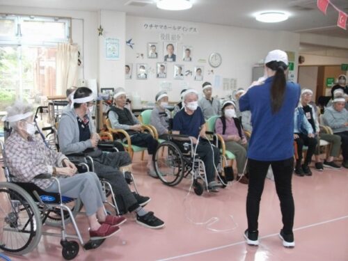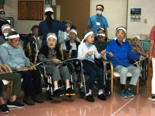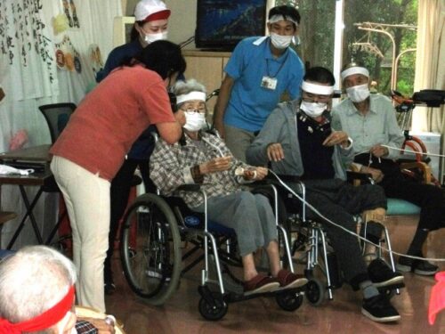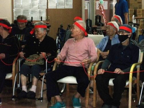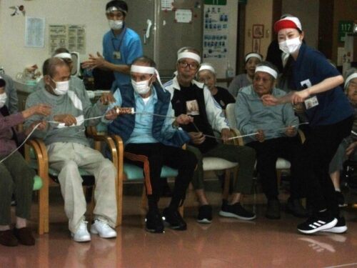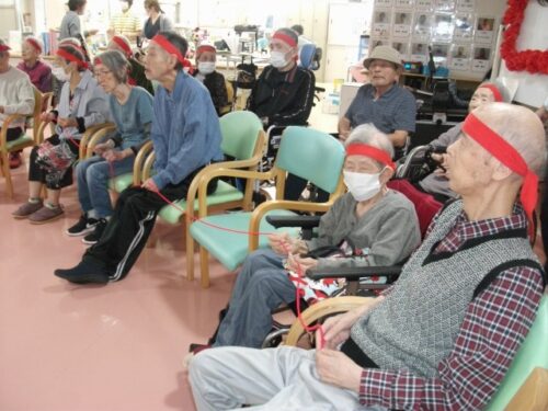 筒渡しとは・・・みんなで細いひもを持ち、トイレットペーパーの芯を通していく競技です