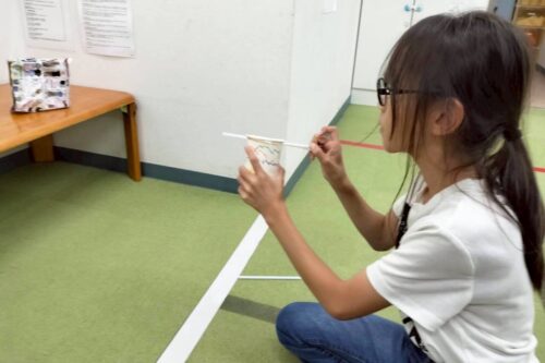 輪ゴムをかけて完成。矢を当てて、飛ばし方を練習します。
