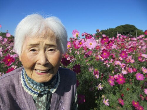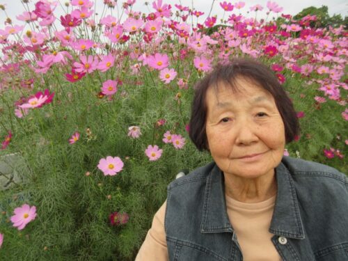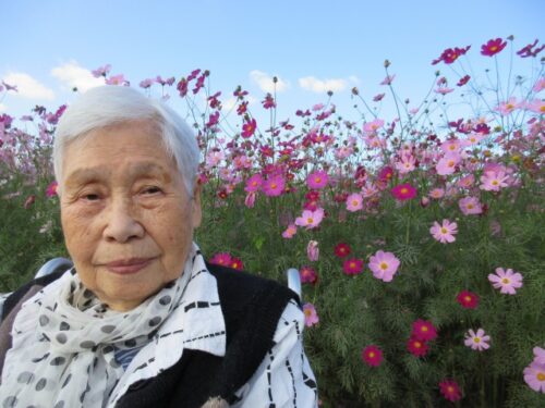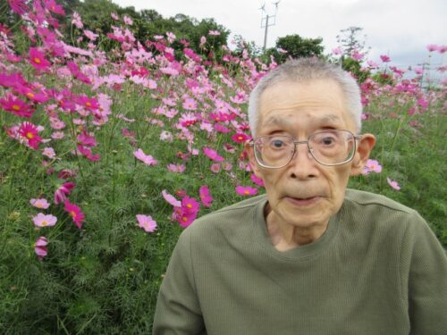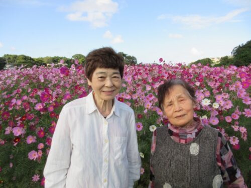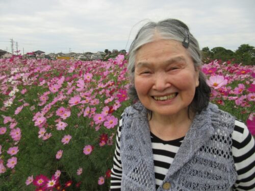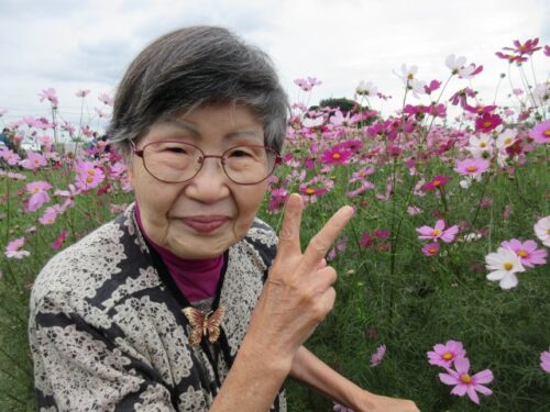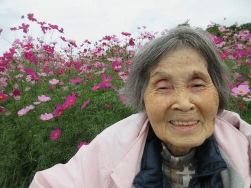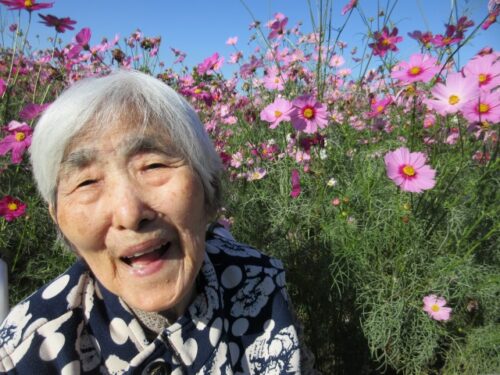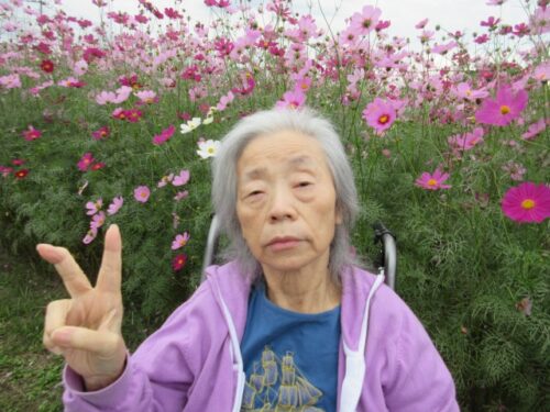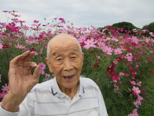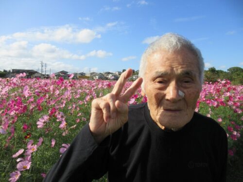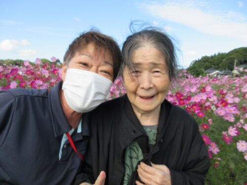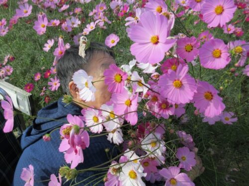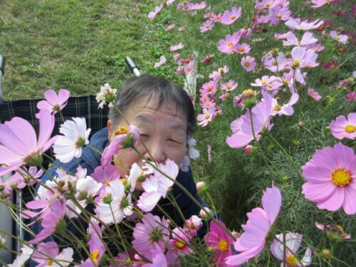 満開のコスモスを前に、「だっこだっこする~」と、コスモスに抱き着くご利用者様も(⌒∇⌒)