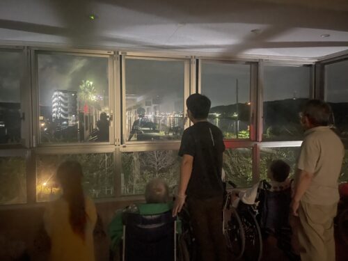 こちらは2階の窓から。穏やかスタッフ男性2名は入居者様と一緒にのんびり鑑賞中!すごく雰囲気が良かったですね(^^♪