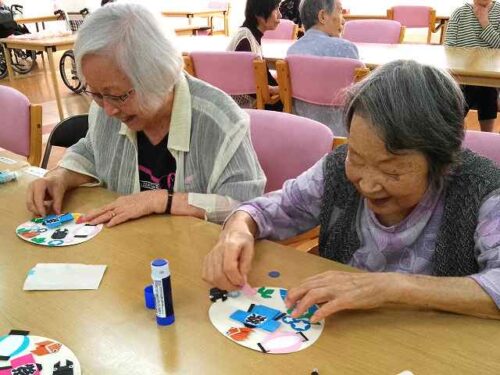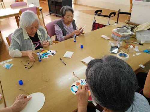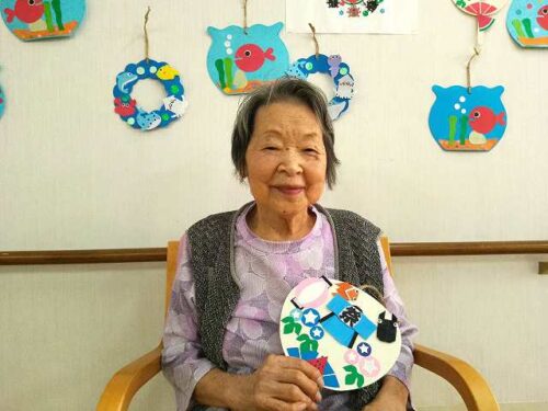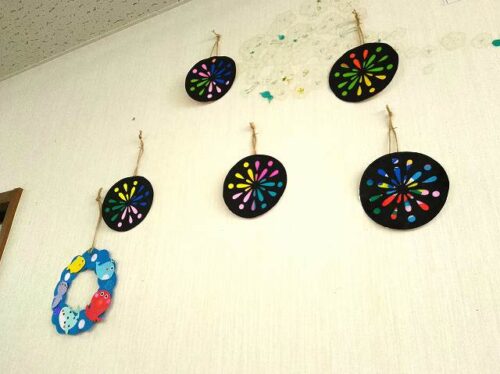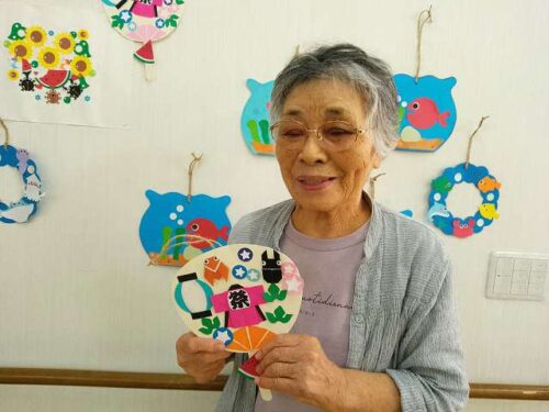 さわやか柏館 3F夏の壁飾り (さわやか柏館 千葉県柏市介護付き有料老人ホーム) 2024-08-03 2024-08-03 こんにちは! 8月3日(土) 3Fで夏らしい壁飾りの工作を行いました! きれいな花火、涼し気な金魚鉢、かわいいうちわで壁が彩られました! 機能訓練員 松本