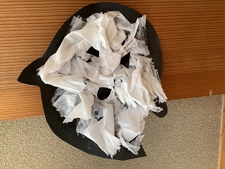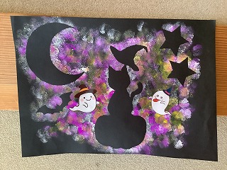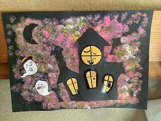 黒の画用紙にハロウィンの家の絵を貼って起き