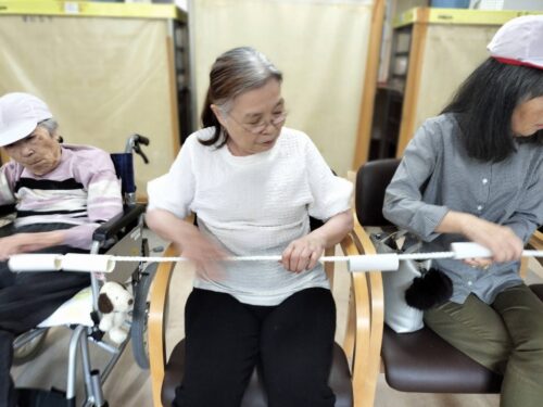 ひもの中を通したトイレットペーパーの芯を横に流していき、先に端から端へ到着したチームの勝ちです。