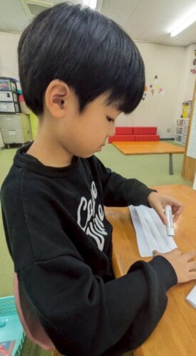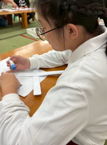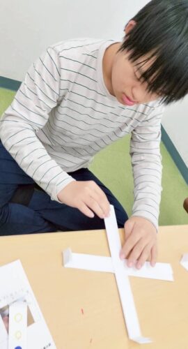 切った紙を折って折り目をつけ、のりで貼り合わせます。