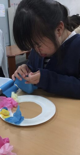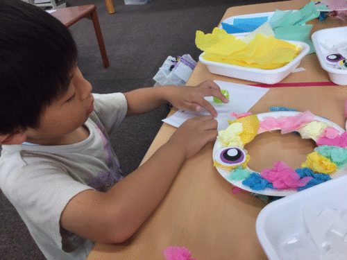 まず、子どもたちはピンク、黄色、青色など、用意されたたくさんの花紙の中から好きな色を選びました🌈そして、その花紙をくしゃっと丸めていきます