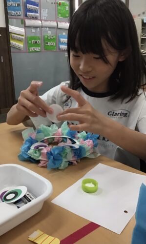 今回の制作活動は、指先の細かい動きの訓練、色々な物の中から好きな物を選択する力を養うことを目的に行いました