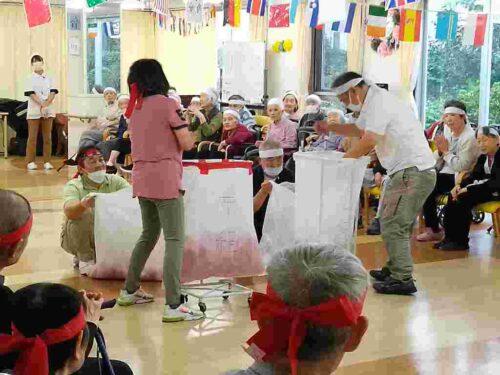 さわやか柏館 運動会~玉入れ~ (さわやか柏館 千葉県柏市介護付き有料老人ホーム) 2025-10-28 2025-10-28 運動会の三種目めは玉入れです。 一人三球で気合十分です。 遠くから投げて入った方もいました。 ほぼ100人が参加して一人三球なので、入ったボールは100個をこえていました。