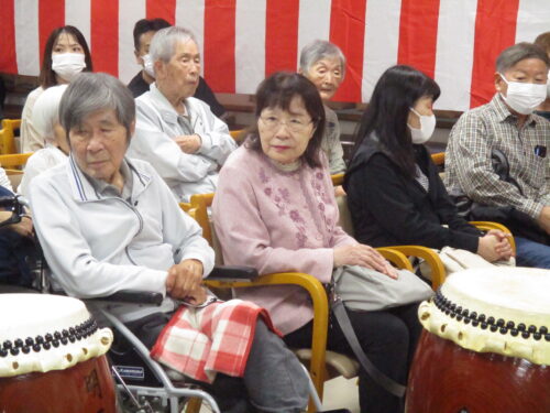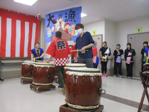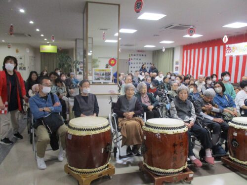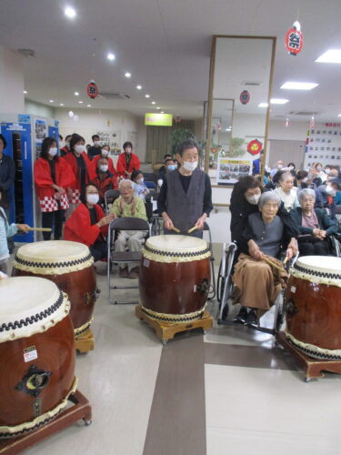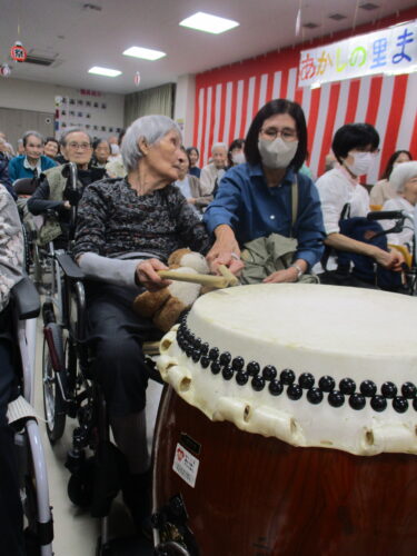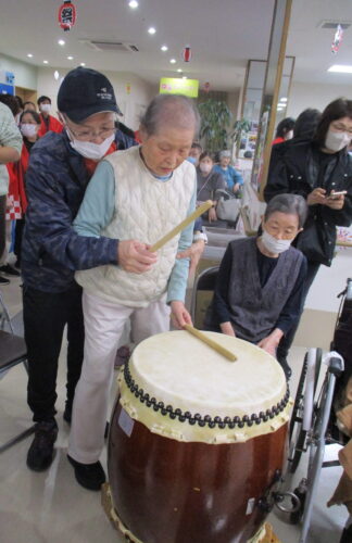 太鼓ボランティアさん達から、「ぜひ皆さんも太鼓をたたいてみましょう!」とお誘いが!