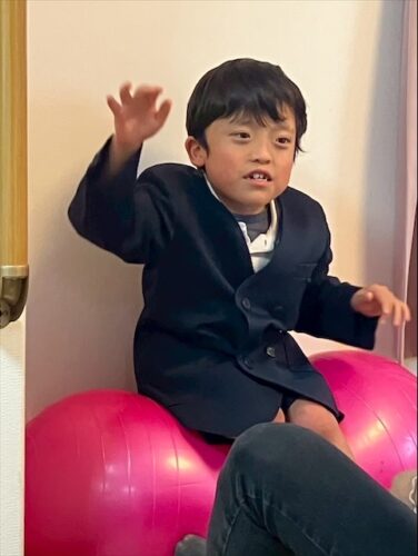 こちはPTによるリハビリをしています。ピーナッツ型のバランスボールを用いて重心移動や姿勢制御の訓練を行っています。児童達が楽しいと思えるよう遊びの要素もおりまぜながら楽しく訓練に取り組んでいます。