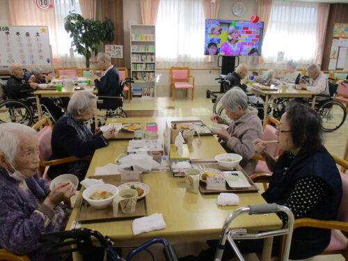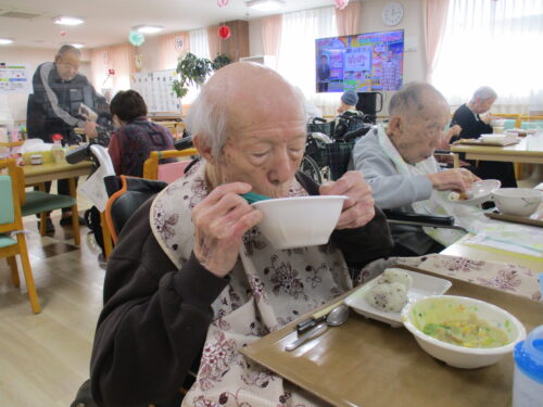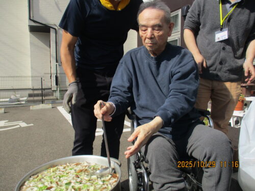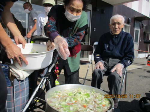 材料を鍋に入れて頂く事、混ぜて頂く事、味付けまで、ご入居者様・ご利用者様にお手伝い頂き美味しい芋煮汁が完成!!