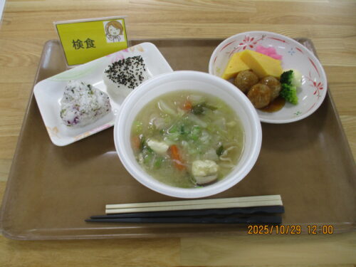 昼食には、おにぎりと芋煮汁でいただきます♪(^_-)-☆