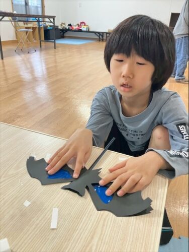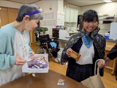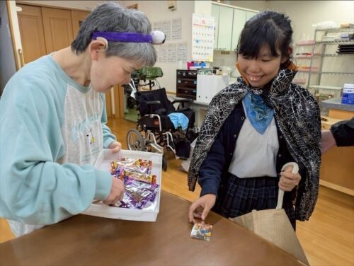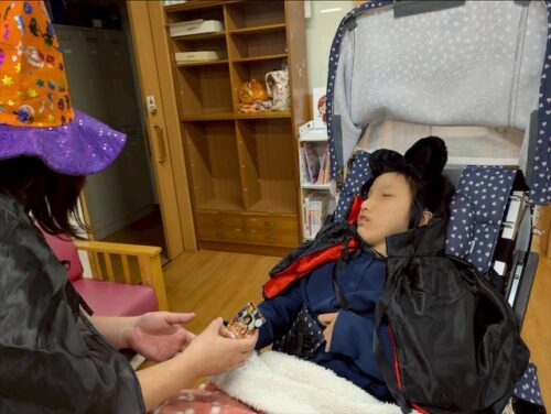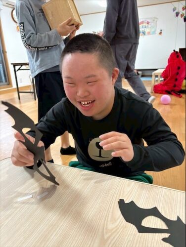 そして、出来上がったものを手に持ち、マントや帽子など仮装をして一階の生活介護へ遊びに行きました😊