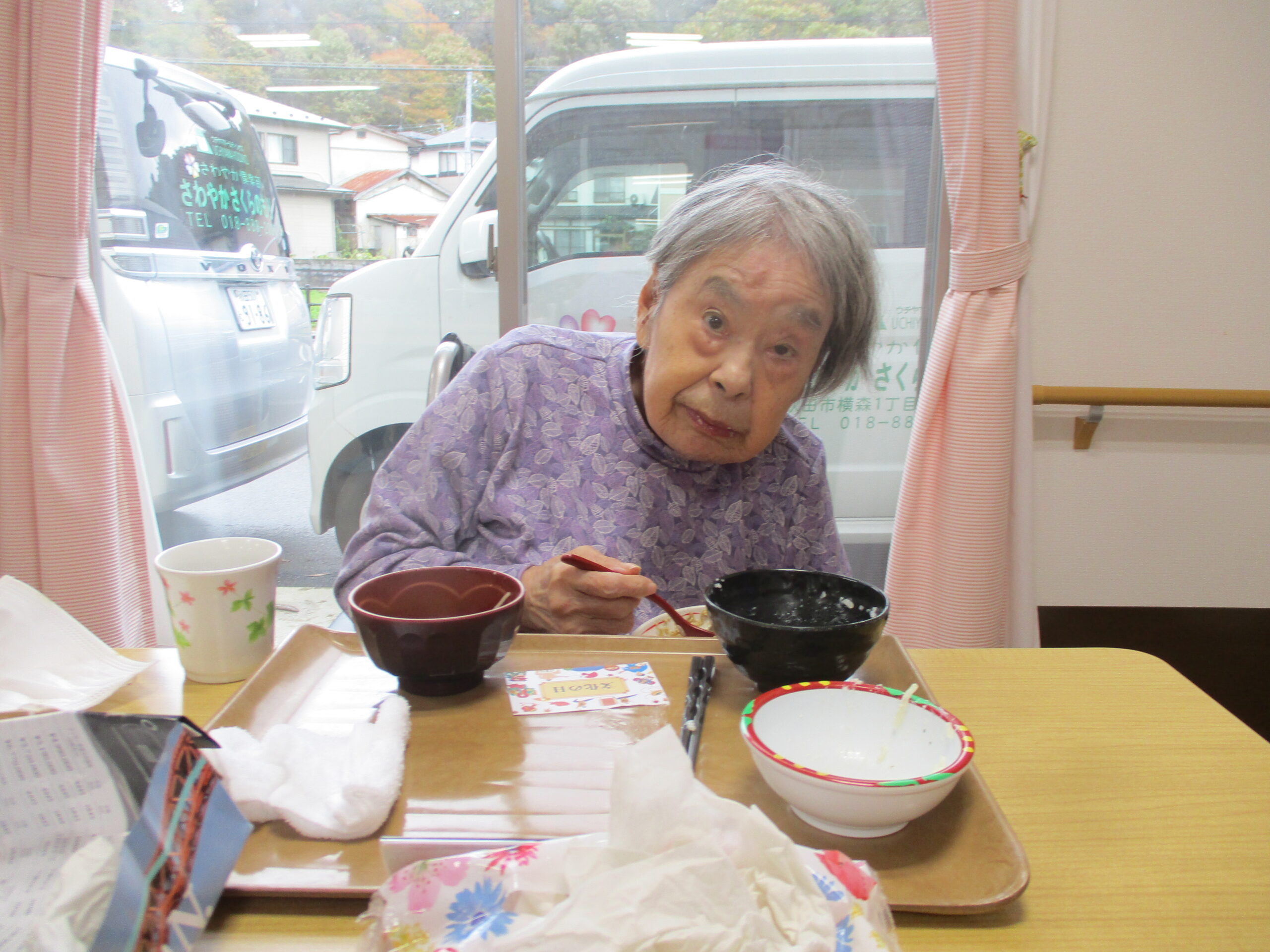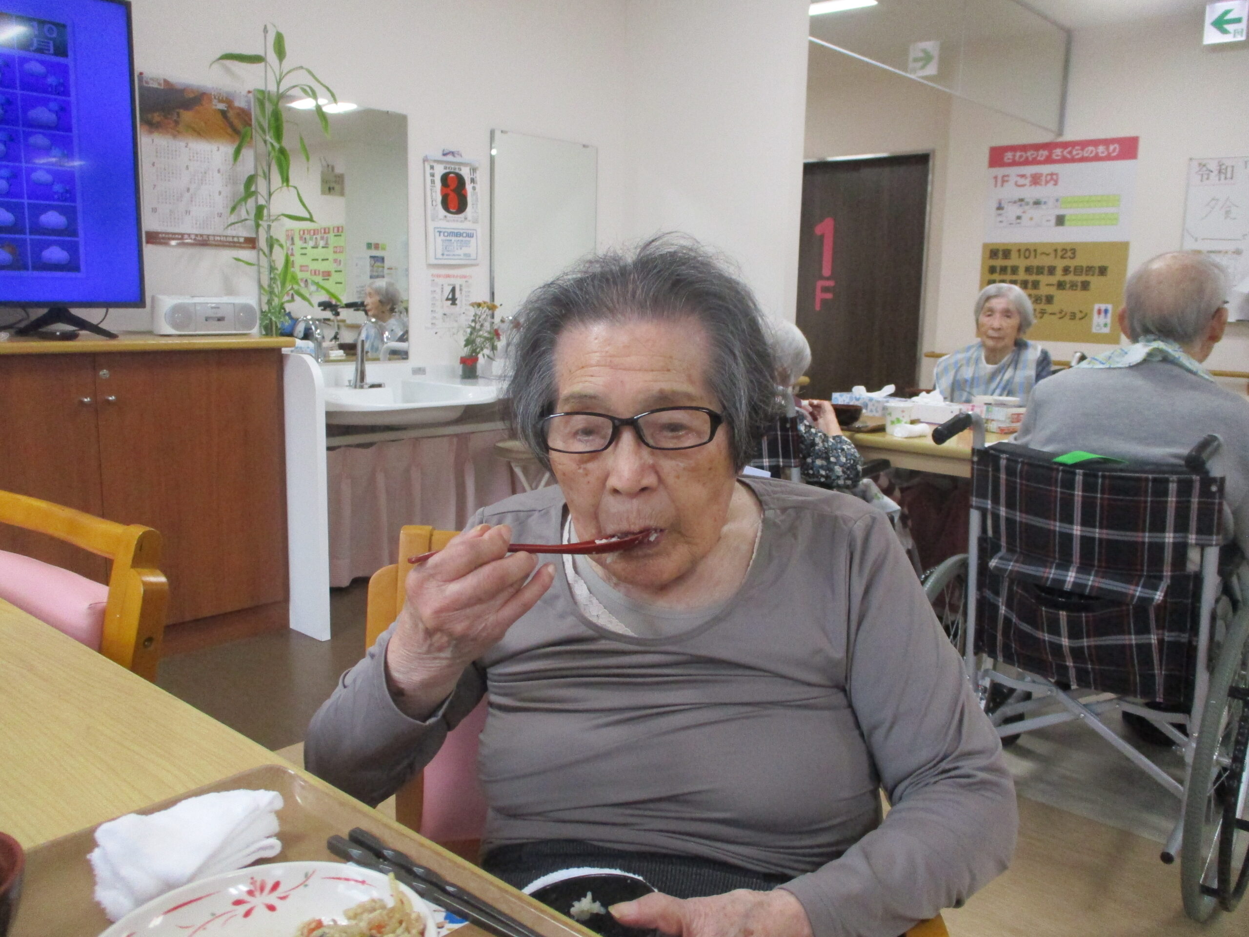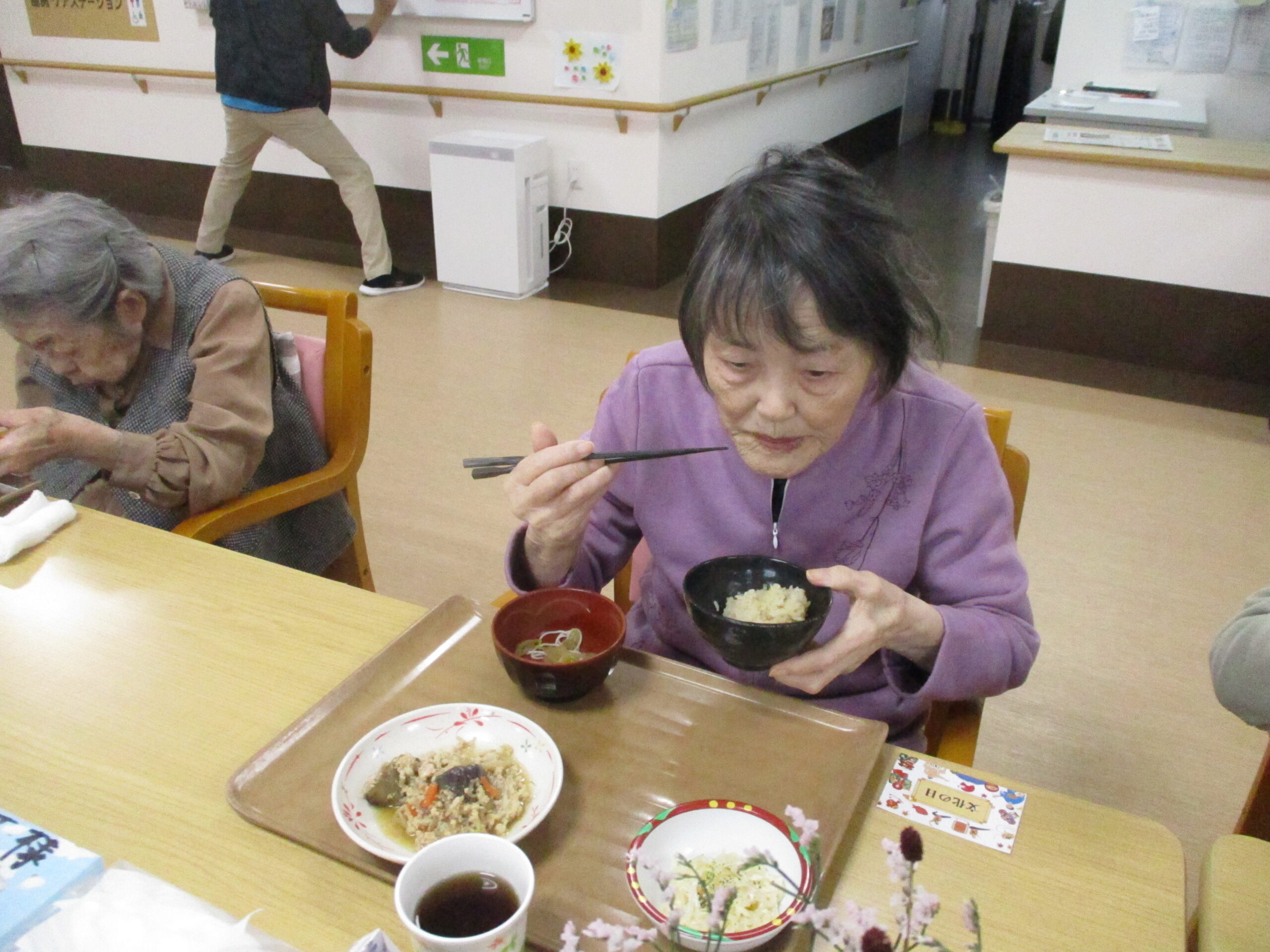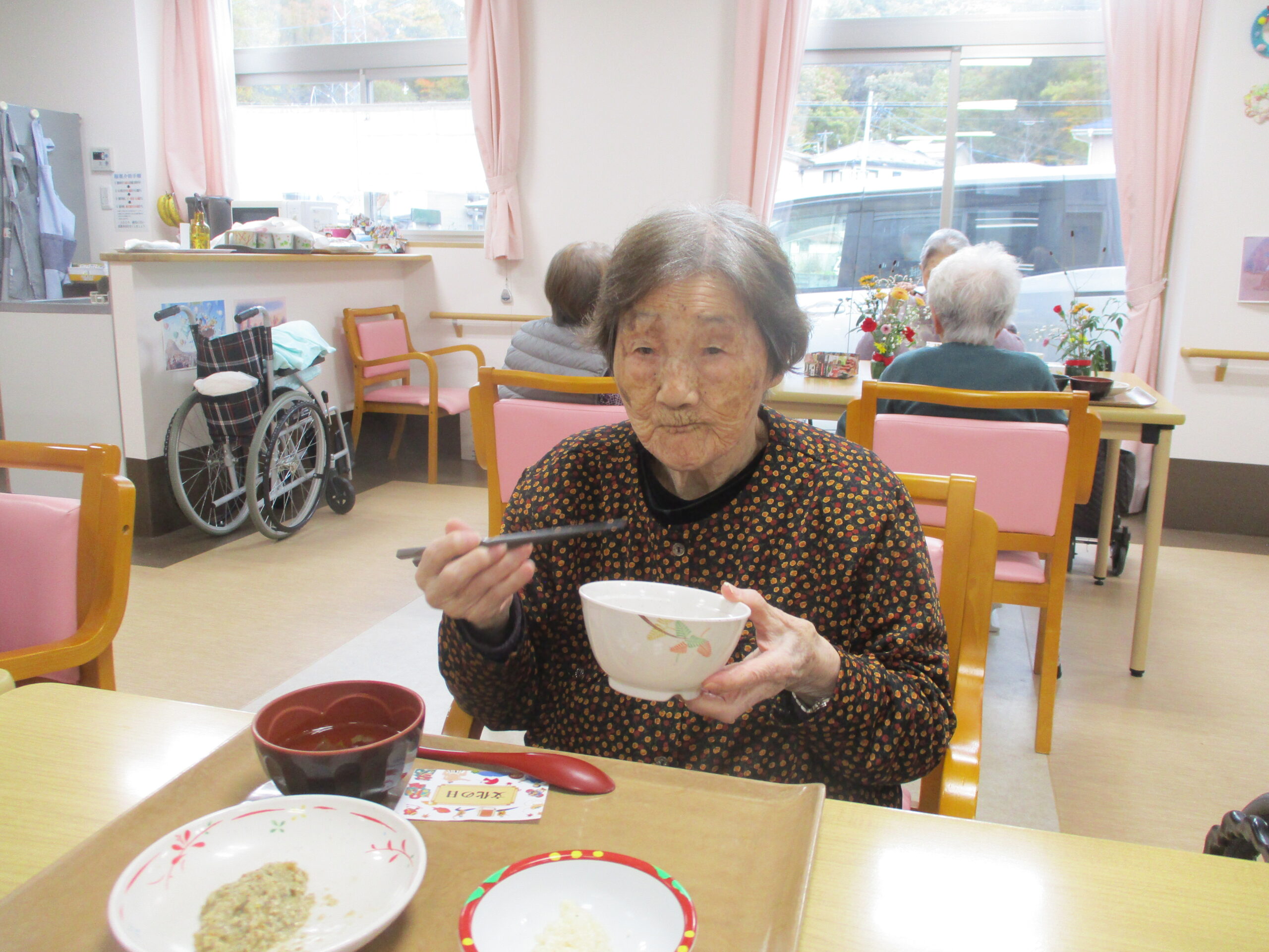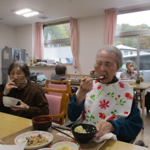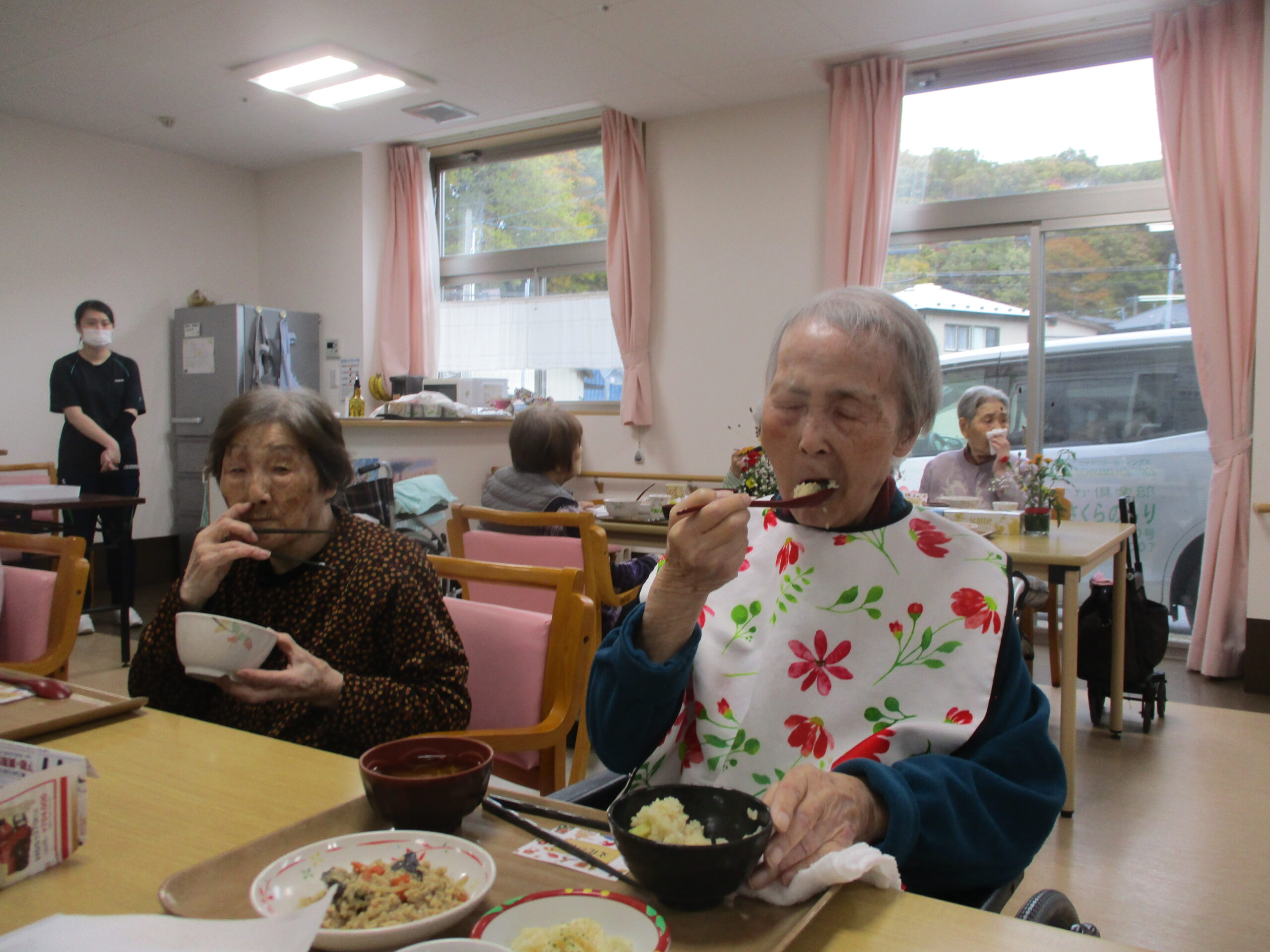 今日は今が旬のさつま芋を使ったさつま芋ご飯でした。皆さん美味しそうに食べてますね。「さつま芋の味がしてとても美味しい。」と笑顔で話されておりました。昼食の様子も撮りましたが、今日は今朝雨降っておりましたがその後天気回復して少し散歩されておりました。熊は遭わなかったです。では散歩の様子も見て見ましょう。