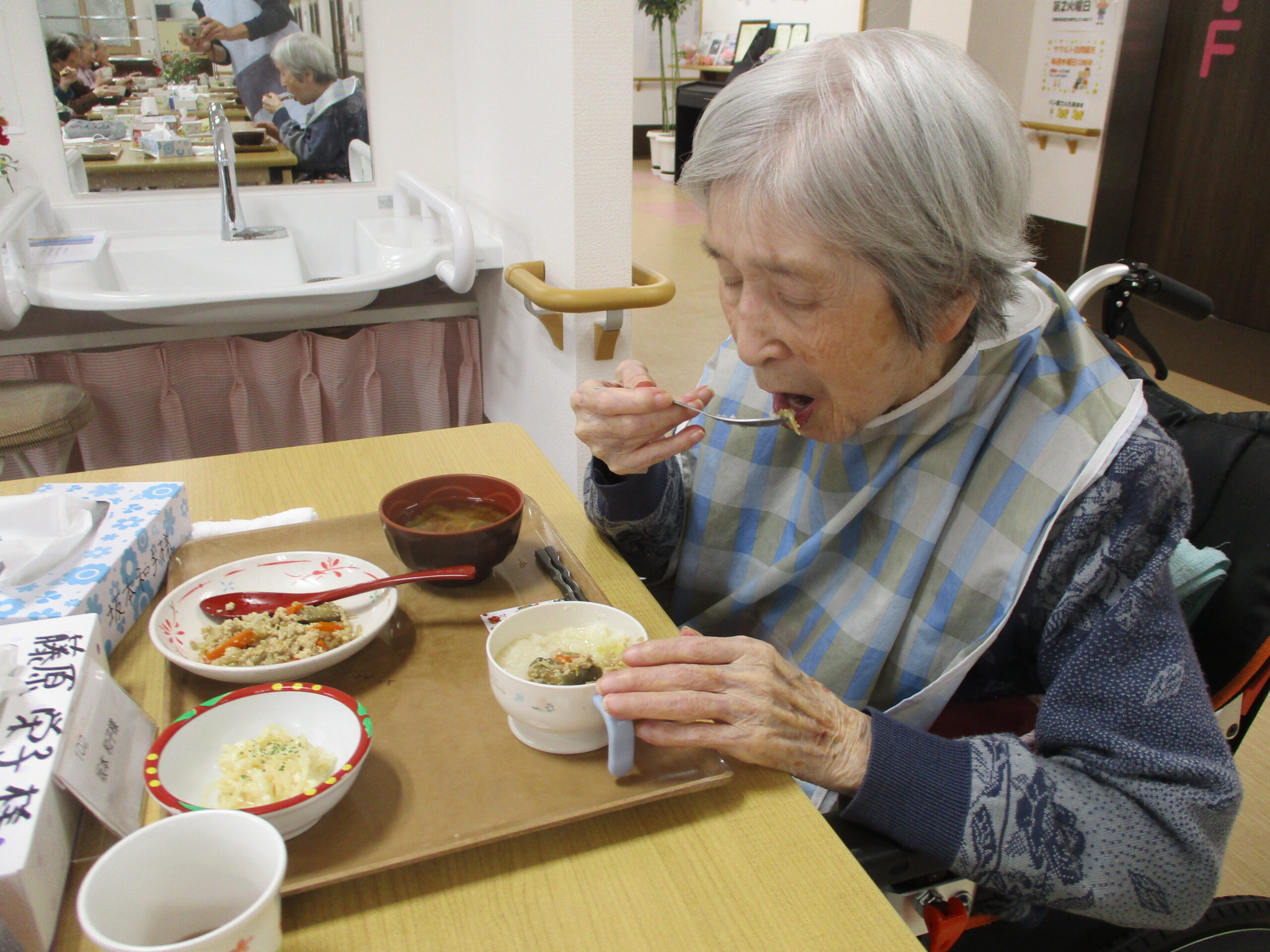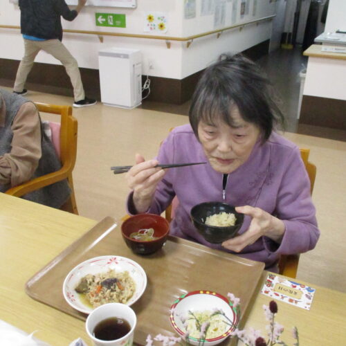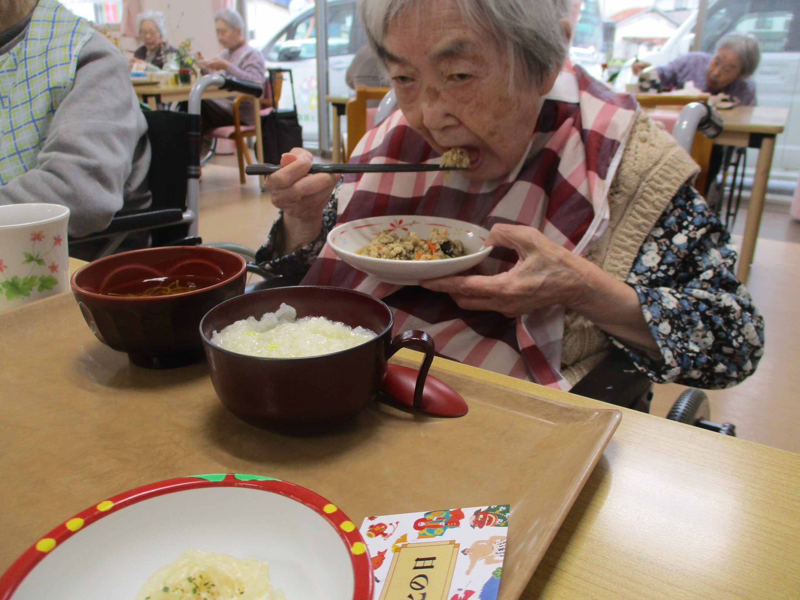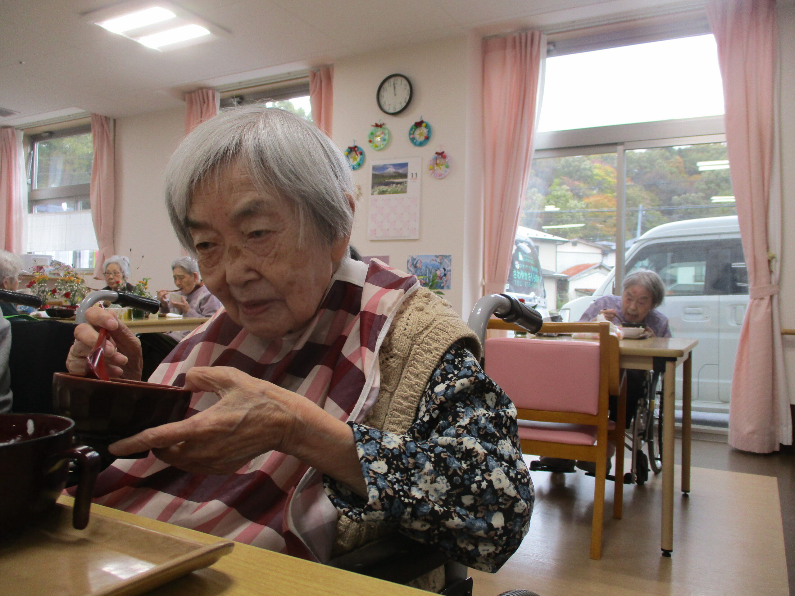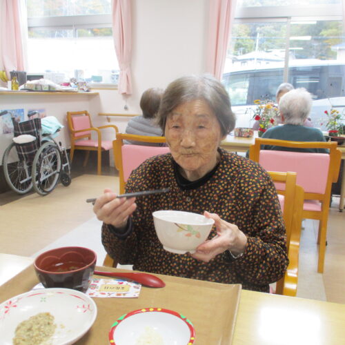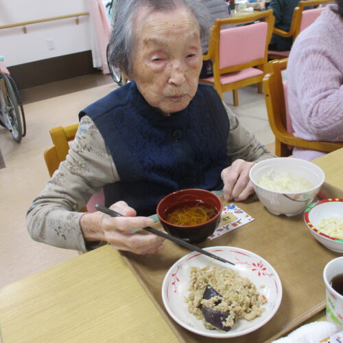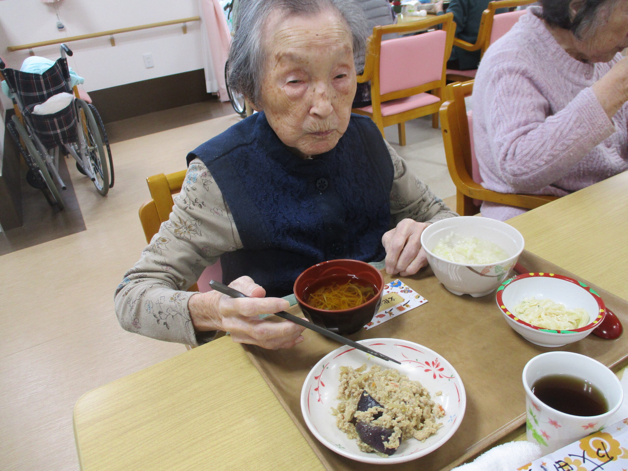 今日は今が旬のさつま芋を使ったさつま芋ご飯でした。皆さん美味しそうに食べてますね。「さつま芋の味がしてとても美味しい。」と笑顔で話されておりました。昼食の様子も撮りましたが、今日は今朝雨降っておりましたがその後天気回復して少し散歩されておりました。熊は遭わなかったです。では散歩の様子も見て見ましょう。