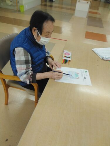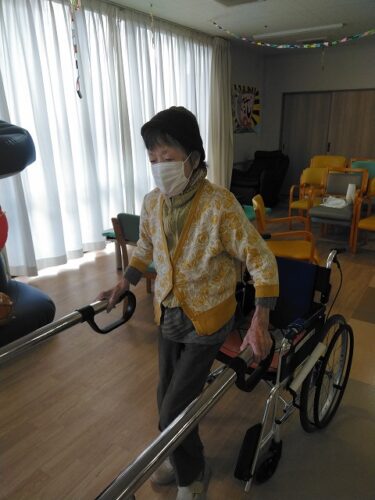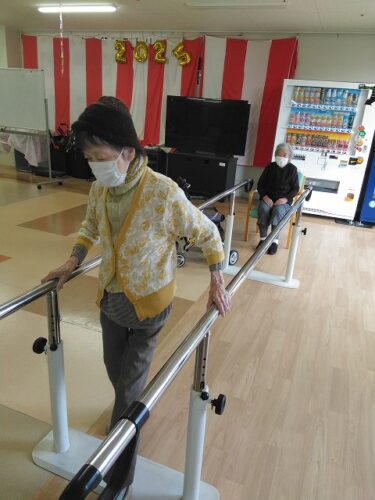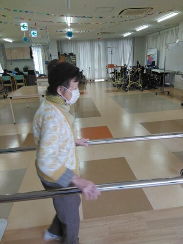 外は肌寒いですが多目的ホールではリハビリをがんばっています。