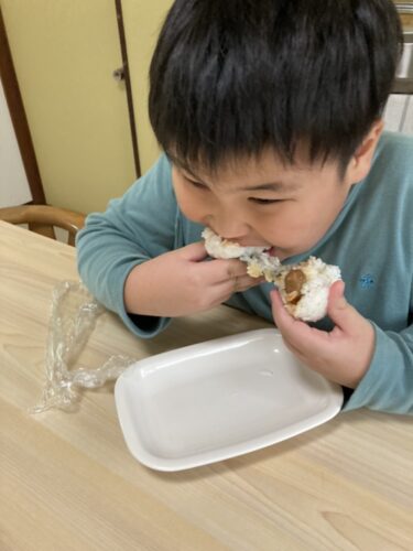 自分で作ったおにぎりは格別!完成したおにぎりを大きな口で頬張る姿は、見ているこちらも嬉しくなります😊 中に入れた具材も美味しかったようで、「美味しい!」「もう一つ食べたい!」と、あっという間に完食していました。