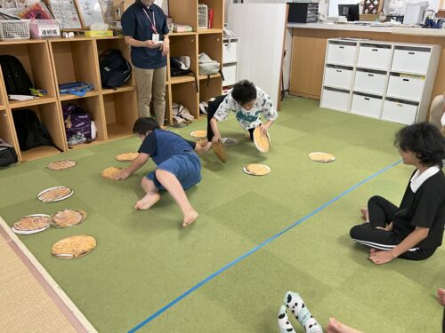 2人ずつ表裏の違う絵の丸型の段ボールを裏返していき、