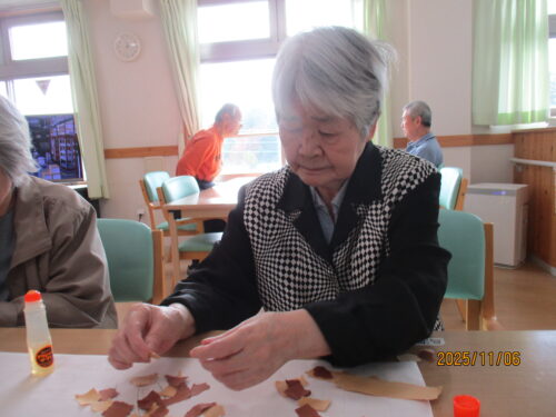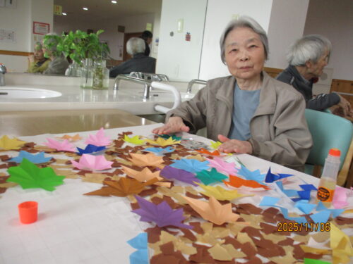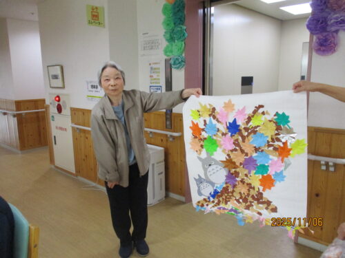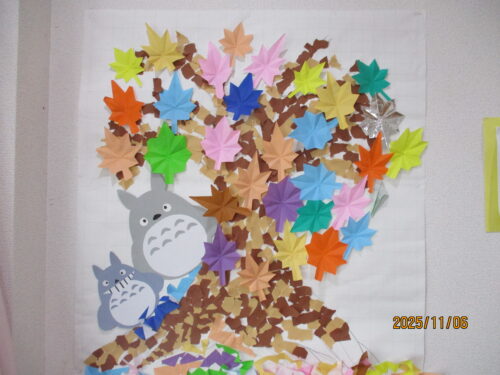 さわやかおおみや館 本日のレク 2025-11-06 2025-11-06 本日はレクリエーションの時間に木にちぎり絵をしていただき 先日作っていただいたもみじを貼り付けていただきました。 色とりどりのもみじで素敵な木が完成しました🎵