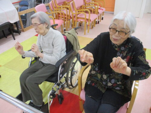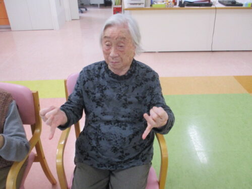 指先の運動も掛け声と一緒に♪「口だけ先に行ってしまって指がついて来ない」と皆様で笑われていました!
