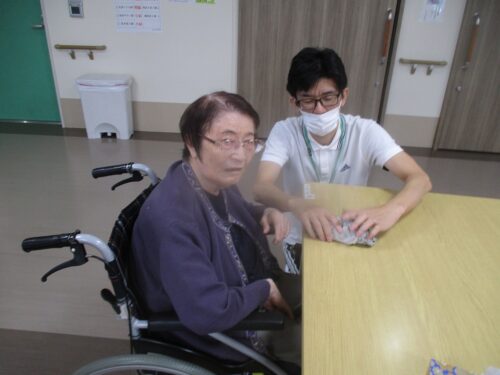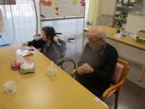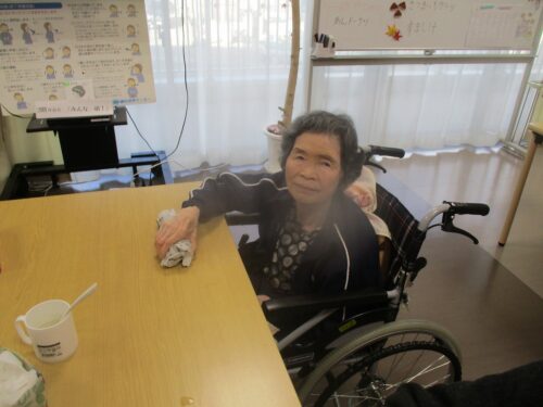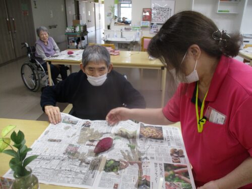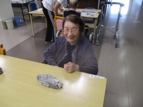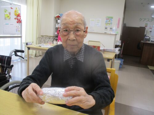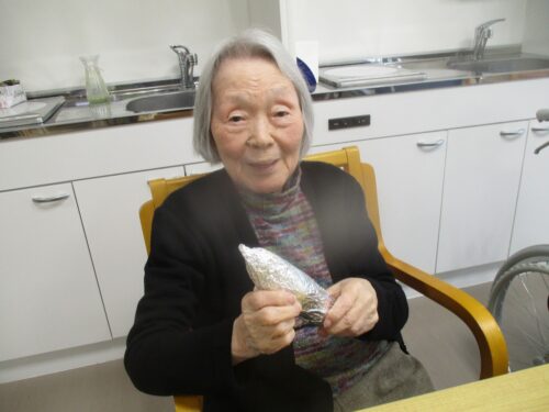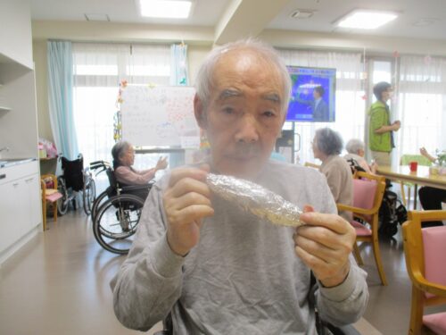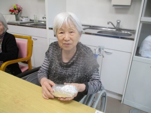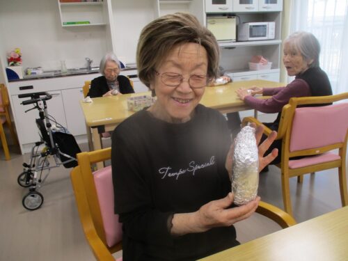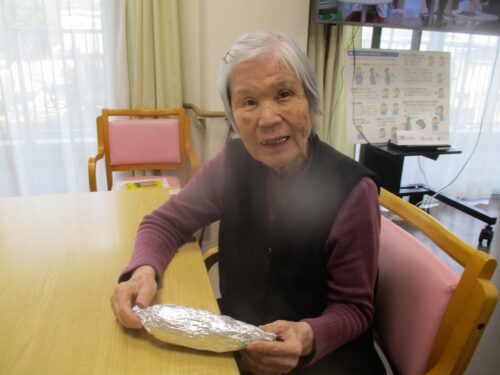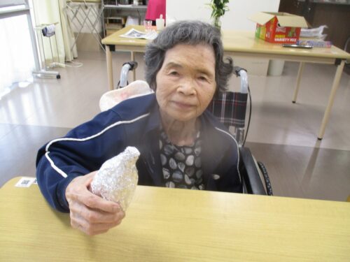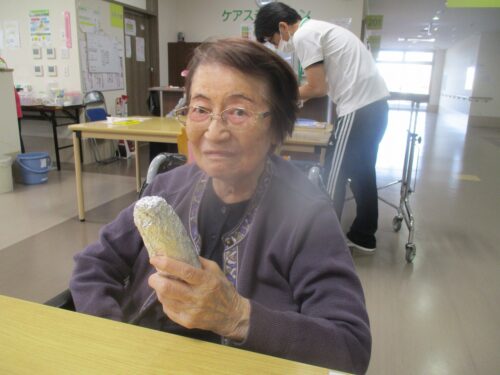 巻き終わったサツマイモを職員に渡した際に『上手に焼いてきてよ。』と職員の肩をやさしくトントンと叩いて鼓舞してくださいました。