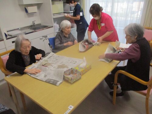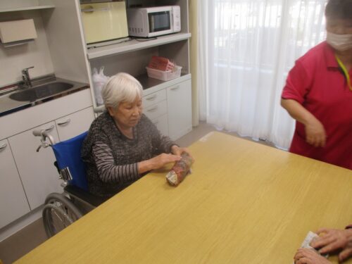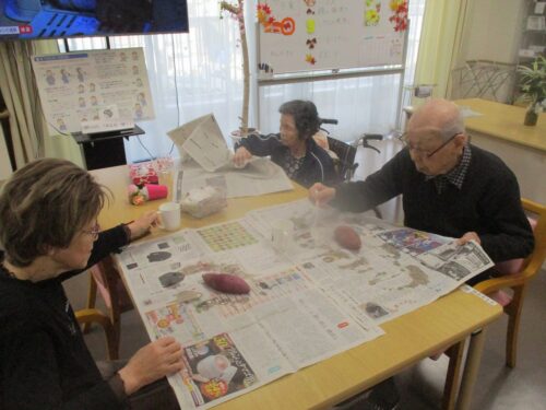 3種類のサツマイモをご入居者様に一つずつ巻いていただきました。