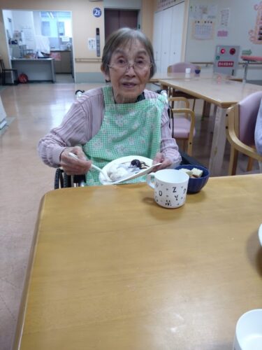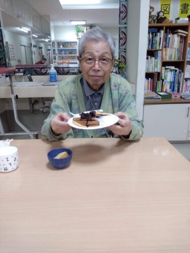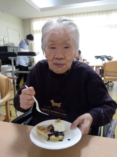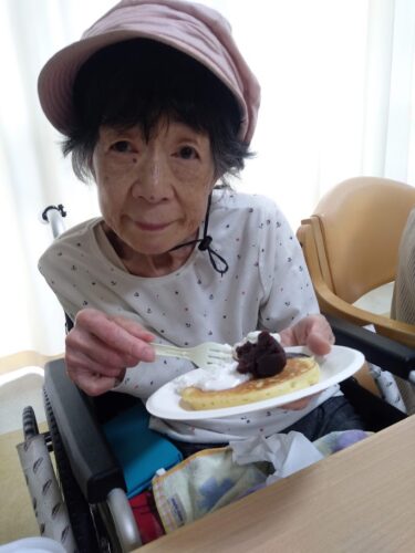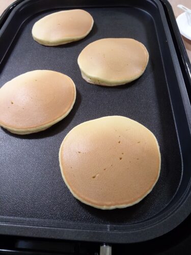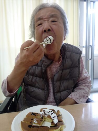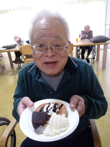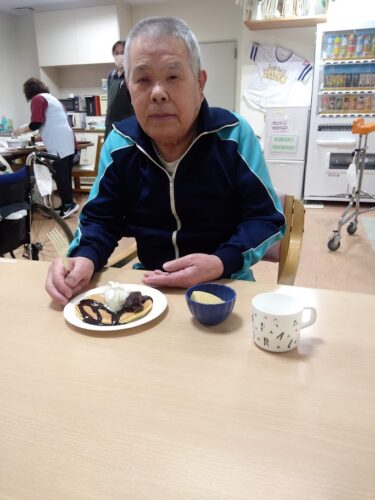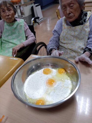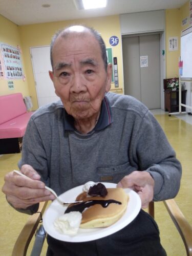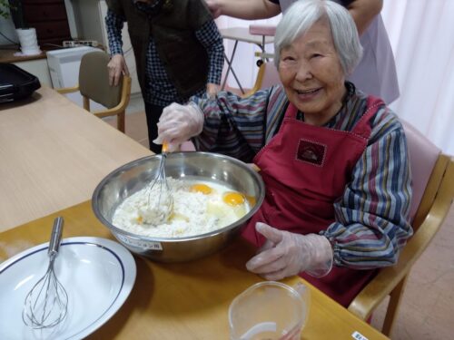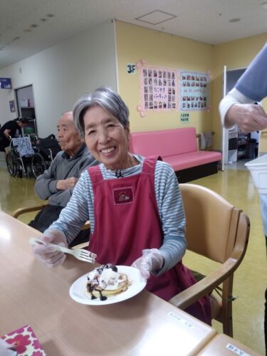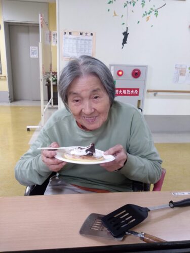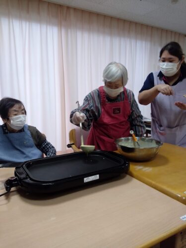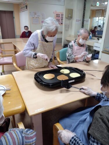 各フロアごとに入居者様がパンケーキの生地を作り、ホットプレートを使い焼き上げて頂きました。