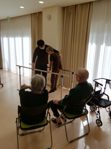 平行棒では入居者様の筋力アップや歩行安定の維持の訓練となっており