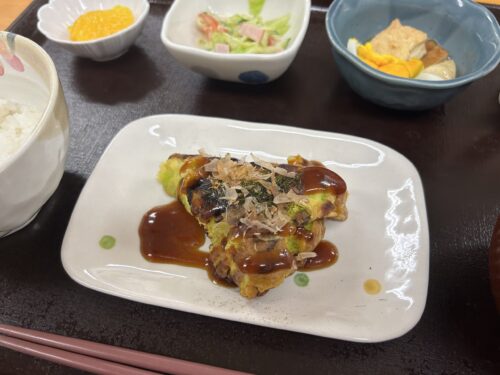 山芋入りの生地に、キャベツ・青ネギ・天かすなど入れて豚肉もいれて焼き上げました(/・ω・)/