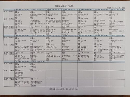 さわやかいずみ館 11月後半 さわやかいずみ館 2025-11-15 2025-11-21 こんにちは😊 11月15日~30日の 献立表です🍴 いずみ館 予定表 11/19 フラワーアレンジメント 11/20 外出レクリエーション(耶馬渓) 11/22 訪問理美容 11/30 誕生会