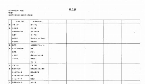 さわやかあかしの里 今週の献立♪ 2025-11-22 2025-11-22 今週(11/22~11/30)の献立です🥄 11/23(日)は、運動会開催予定となっております。 その日の昼食は、少しでも運動会気分を味わっていただこうと、 厨房さん協力のもと、お弁当を提供させていただきます。 お楽しみに🍱