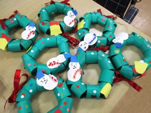 緑のリースに、雪だるまとベルを貼り付けて出来上がりです!