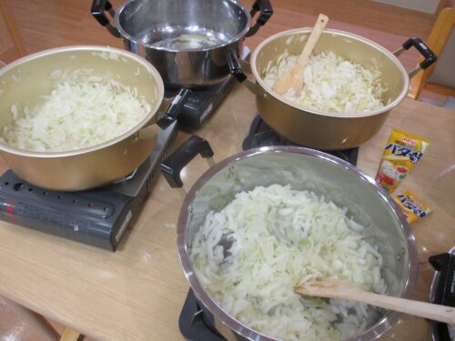 野菜のカットが終わったらバターでこんがり玉ねぎを炒めていきます。
