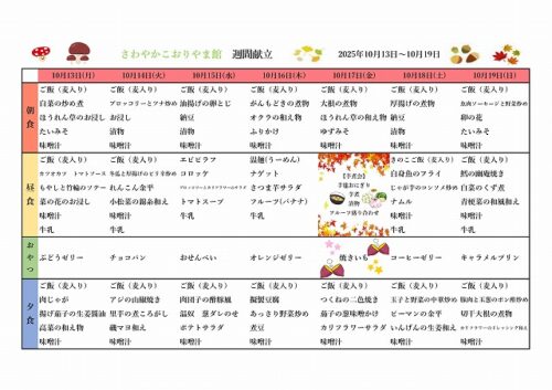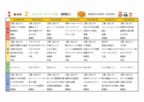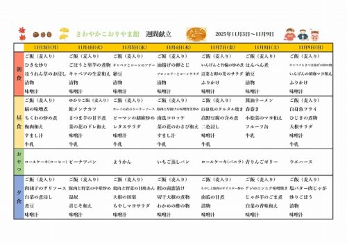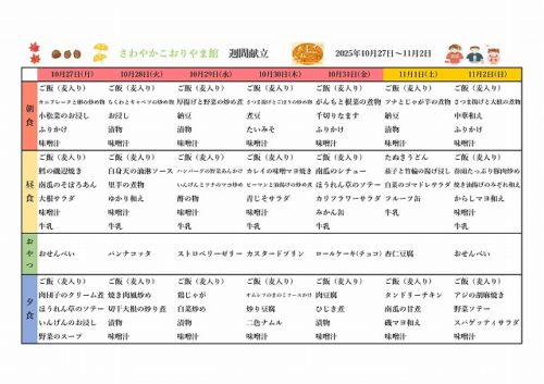 さわやかこおりやま館 今週の献立表🍚☆さわやかこおりやま館 2025-11-24 2025-11-24 こんにちは、さわやかこおりやま館です(^▽^)/ 今週の献立(11/24~11/30)こちらになります🍚 担当:千葉