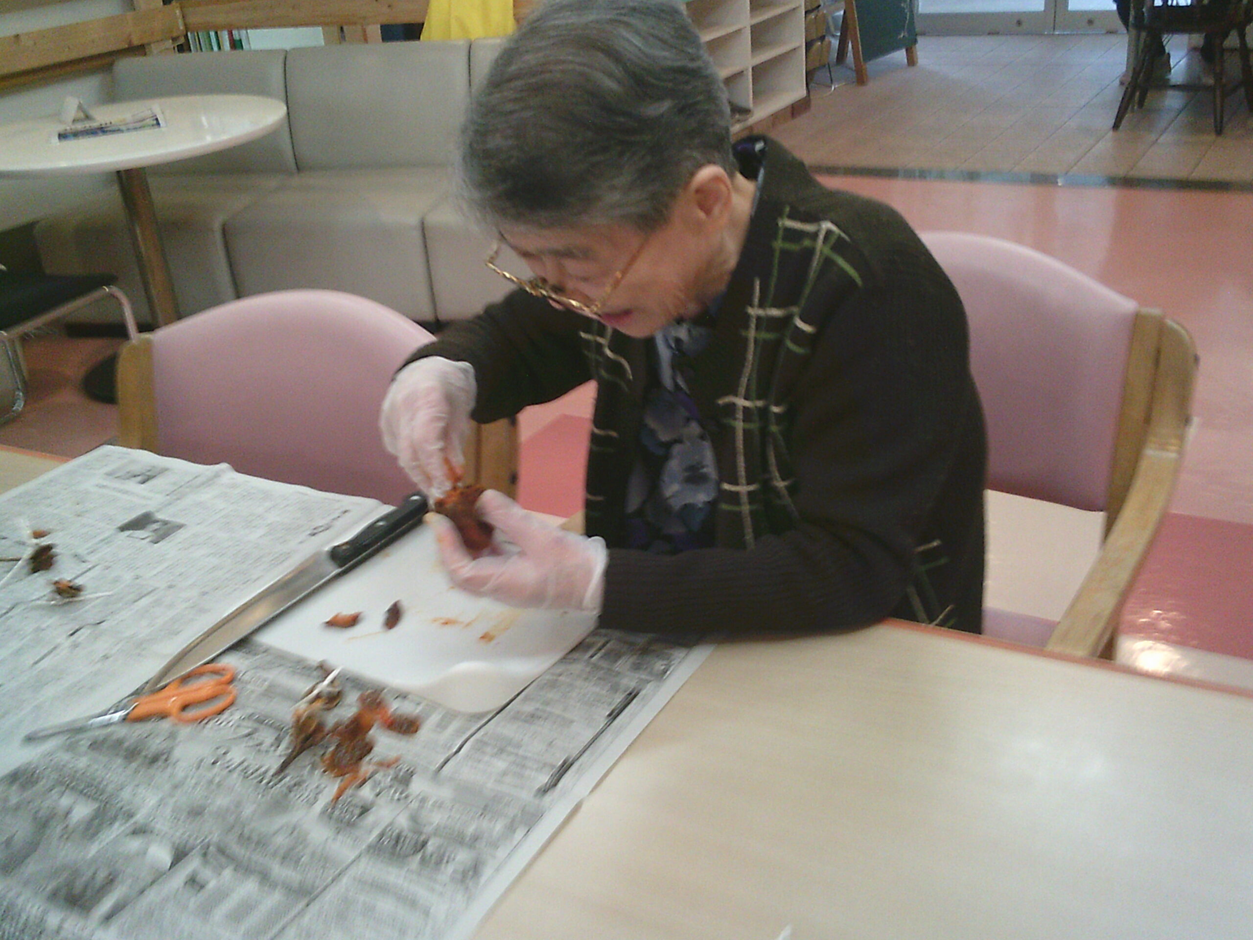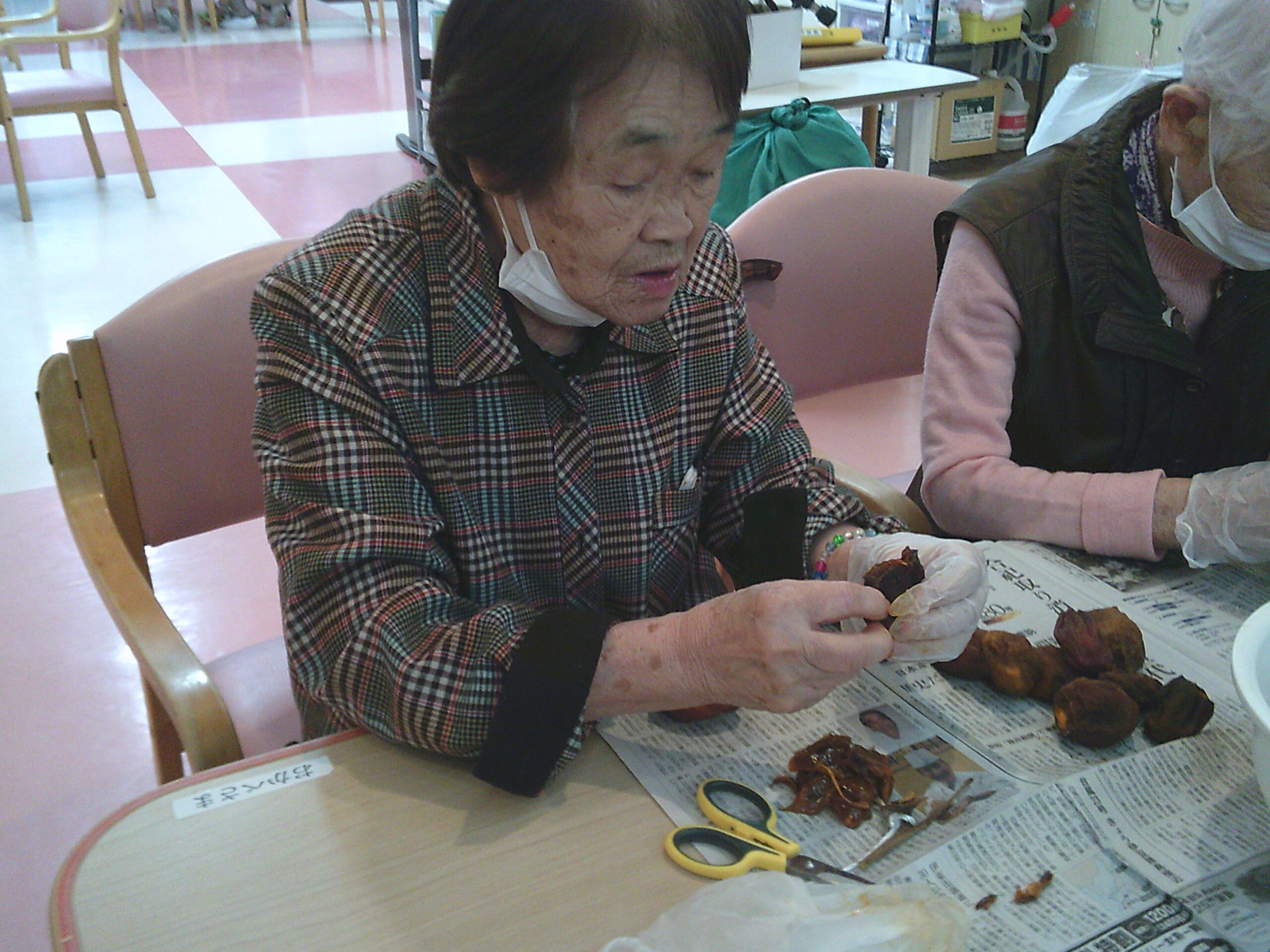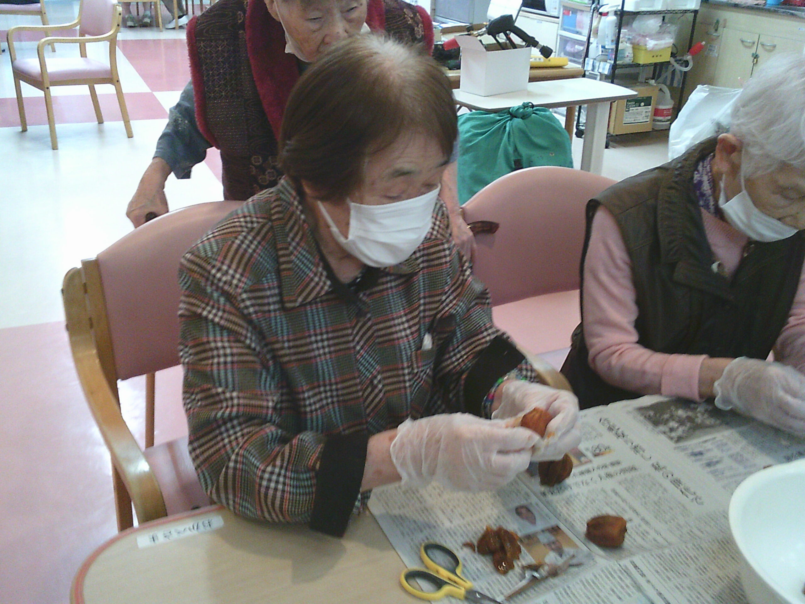 さわやか花美館 干し柿 2025-11-30 2025-11-25 いよいよ干し柿を食べれる時がやってきました 入居者様には柔らかい状態で召し上がってもらうため、固くなる前に食べます へたと種を取る作業から始めます 協力してもらったので早く終わりそう 作業中に我慢できずにつまみ食い(笑) 甘くておいしいと言ってました!! 手伝ってくれた方で先に味見をしました たくさんあったのでこの後のおやつが食べれないくらい味見していました(笑) 干し柿つくりのお手伝いをありがとうございました