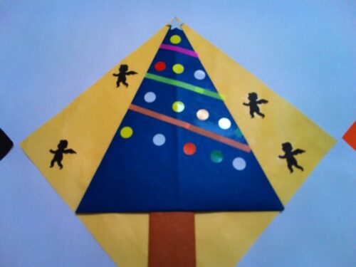 クリスマスツリーの周りを天使が飛んでいます。雪の結晶も見えます。眺めているとクリスマスが楽しみですね。