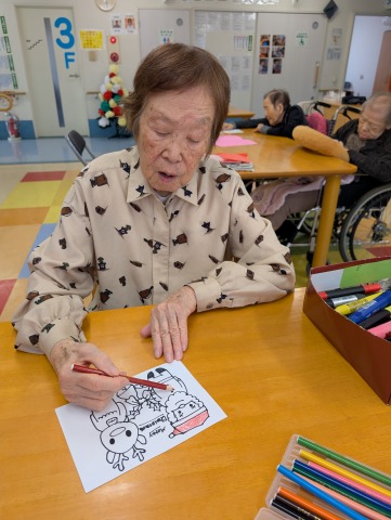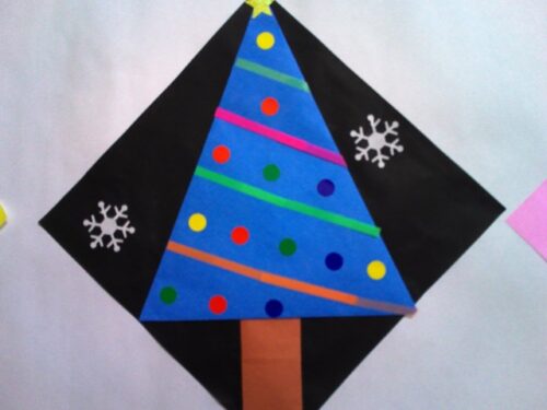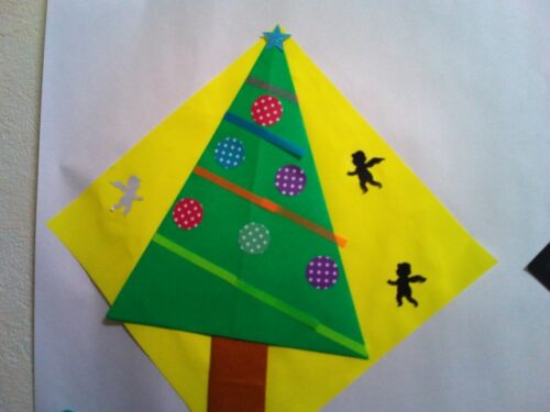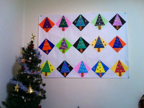 入居者様手作りの「クリスマスツリー」です。       色とりどりのクリスマスツリーが並んでいます。