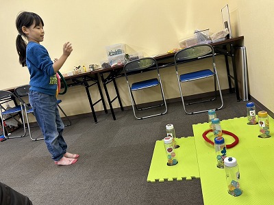 よーく狙って……「それっ!」 狙いを定めて真剣に輪を投げる姿は、まるで小さなスポーツ選手! 輪が入るたびに**「やったー!」**と歓声が上がり、とても盛り上がりました!