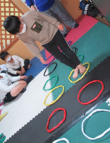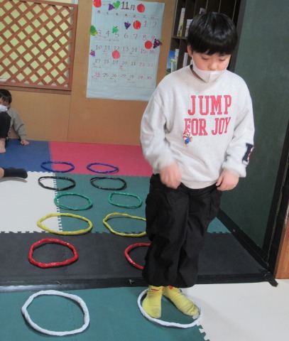 リズムに合わせてフープの上をジャンプで跳んでいく遊びを行いました。