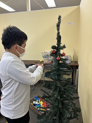 「どこに飾ろうかな?」「赤と金、どっちがいい?」と、お友だち同士で相談しながら、オーナメントを一つひとつ丁寧に飾ってくれました。