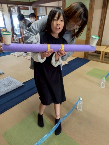 今回は、プールスティクの両端にボールをのせて落ちないように歩きながら