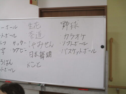 さわやか和歌山館 さわやか和歌山館 最新情報 習い事🖌 2025-12-08 2025-12-01 先日のレクリエーションでは 皆さまが昔していた習い事をお話ししながら ホワイトボードに書き出していました😊♡ 「よくやったなー」「私もしてた!」と 昔を思い出しながら皆さま 楽しくお話しされていました🤗 担当:大島かこ