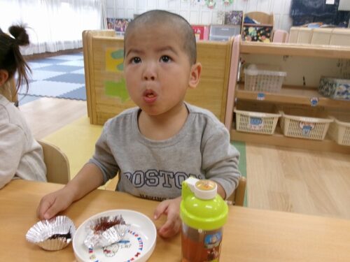 そこにチョコクリーム、ケーキシロップ、イチゴジャムをつけていただきます!