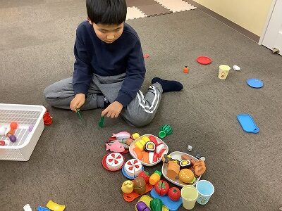 床一面に広がるのは、美味しそうなおままごとの食べ物たち! お寿司やハンバーガー、野菜などが並び、まるで賑やかなレストランのようです。 お皿に盛り付けたり、包丁で食材を切ったり、友達や職員とやり取りをしながら、思い切りごっこ遊びを楽しんでいました。