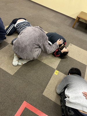 今月の活動では、避難訓練を実施しました。 地震発生を想定し、安全確保の体勢(ダンゴムシのポーズ)の練習から、職員の指示に従って落ち着いて避難経路を確認するところまで、真剣に取り組むことができました。 「おさない・かけない・しゃべらない」の約束を守り、いざという時のための大切な行動をしっかりと学びました。 みんなが真面目に取り組む姿に感心しました。