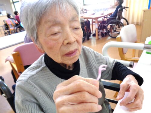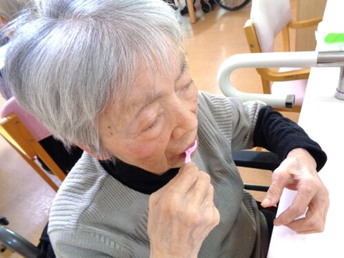 食後の歯磨きに糸ようじを使われケアを頑張られているご入居者様、ナント❣️❣️全部ご自身の歯なんです‼️