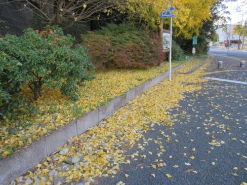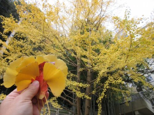 イチョウの木の下には黄色い絨毯が広がっていて、ハラハラと散る葉っぱも季節感満載😊